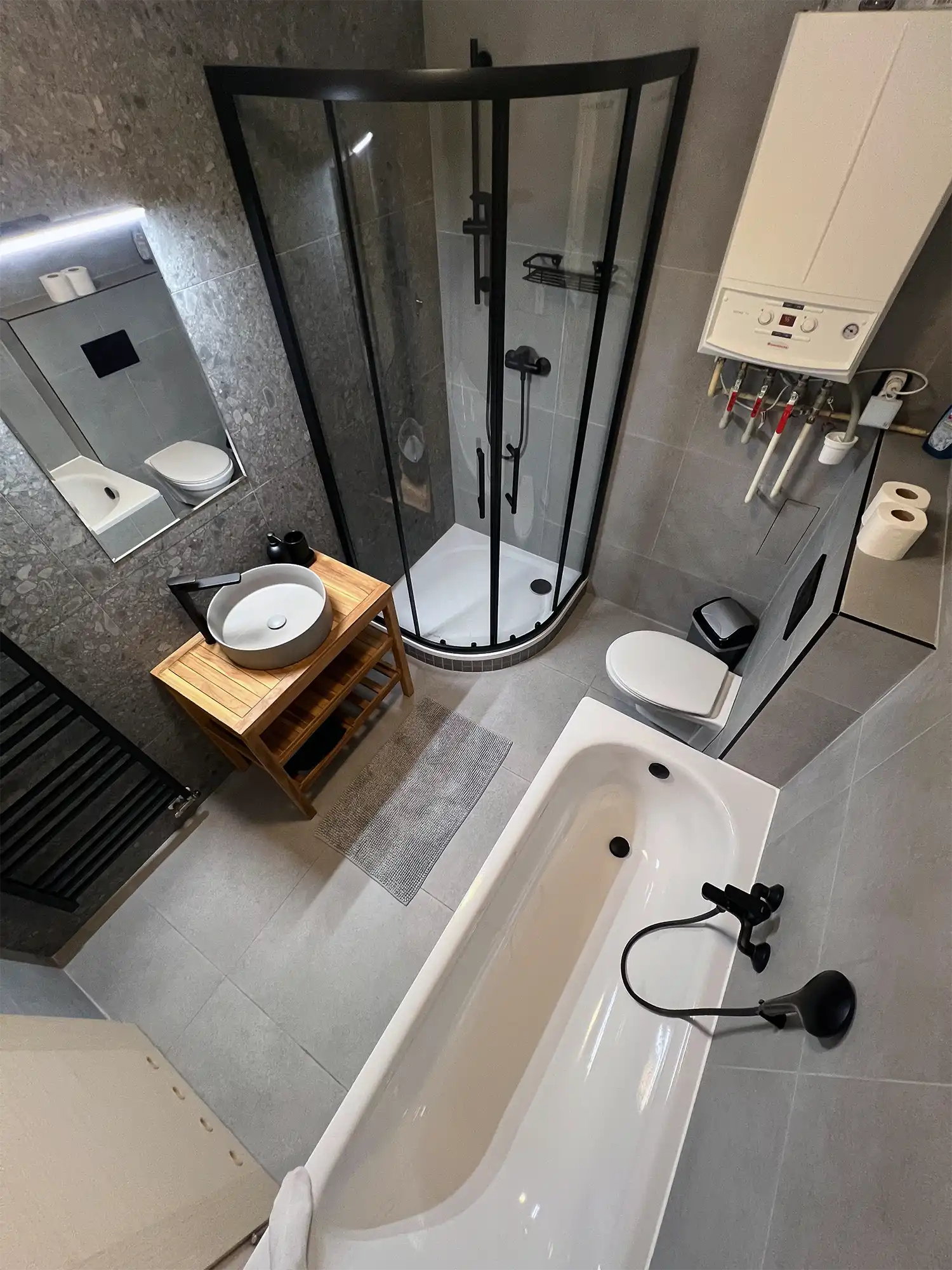 Samostatná ložnice s pohodlnou manželskou postelí zajišťuje klidný odpočinek po dni plném zážitků. Elegantní koupelna kombinuje praktičnost s luxusem – najdete zde jak sprchový kout, tak vanu a WC.