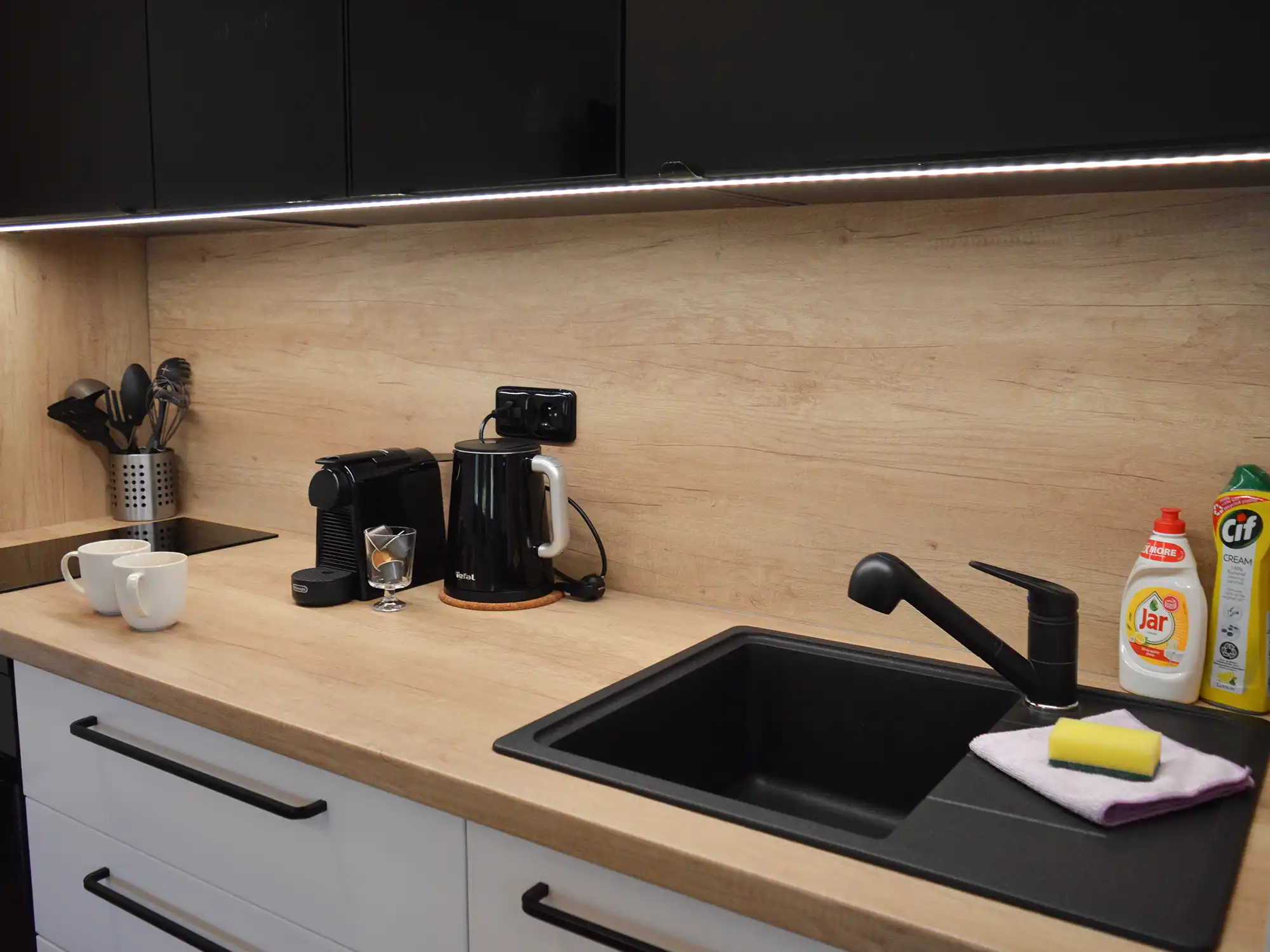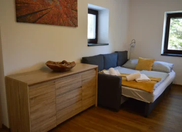 Moderní a útulný apartmán nabízející veškerý komfort pro váš relaxační pobyt. Prostorná předsíň vás uvítá při vstupu do světlého obývacího pokoje s pohodlnou rozkládací pohovkou a LED televizí. Plně vybavený kuchyňský kout disponuje vším potřebným včetně lednice, rychlovarné konvice, mikrovlnné trouby a indukčního vařiče.